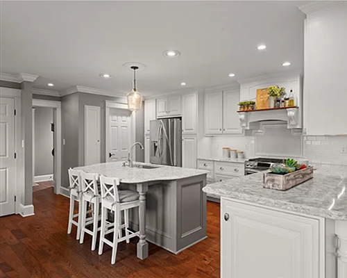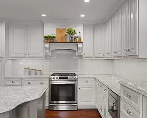 with quartz counter tops, awesome island, many unique built-ins and stainless